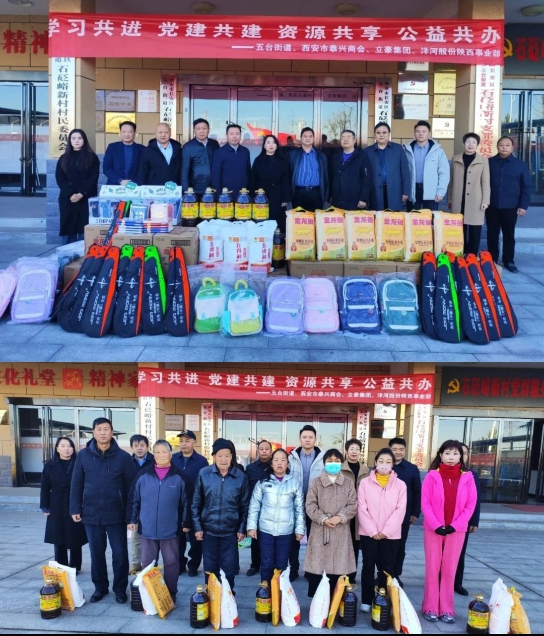 11月29日,為實(shí)現(xiàn)黨組織優(yōu)勢(shì)互補(bǔ)、資源共享的黨建新格局,立豪集團(tuán)聯(lián)合五臺(tái)街道、西安市泰興商會(huì)、洋河股份陜西事業(yè)部開展“學(xué)習(xí)共進(jìn)、黨建共建、資源共享、公益共辦”主題活動(dòng),為五臺(tái)街道困難老黨員、困難群眾、退役軍人、留守兒童送溫暖獻(xiàn)愛心。五臺(tái)街道黨工委副書記韓盈、立豪集團(tuán)董事長(zhǎng)、西安市泰興商會(huì)會(huì)長(zhǎng)桂志明、西安市泰興商會(huì)企業(yè)代表、五臺(tái)街道各村支書、群眾代表共50余人參加活動(dòng)。